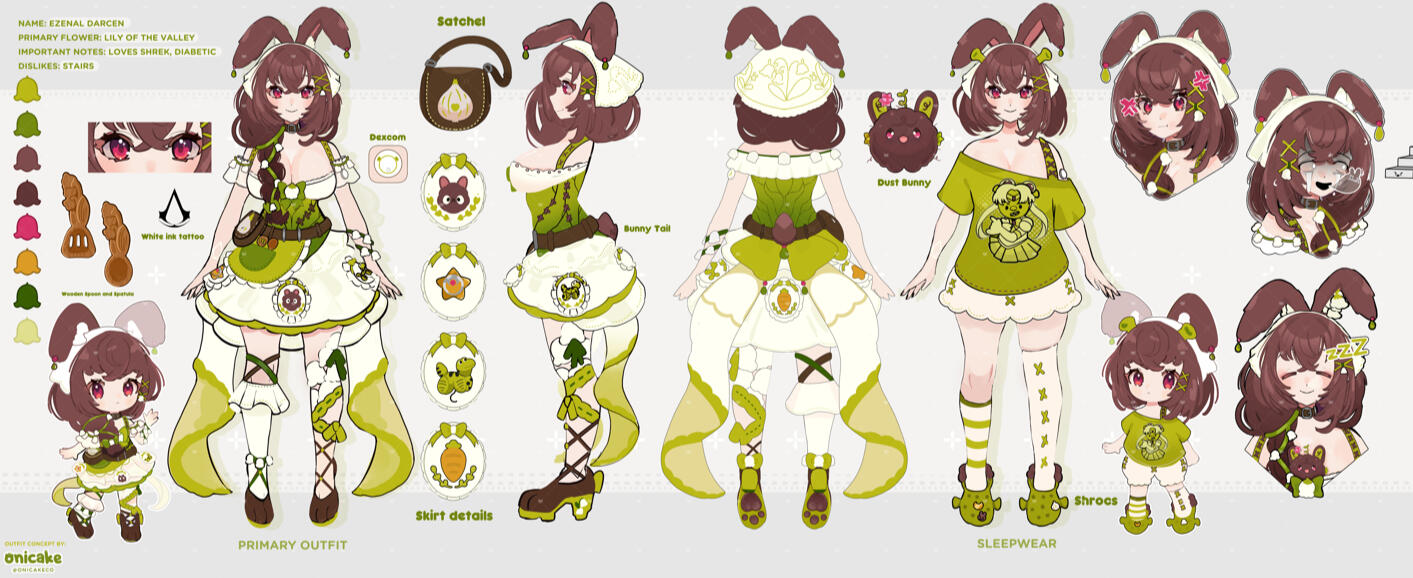 In the heart of the Whispering Woods, where cherry blossoms whisper secrets and rivers hum ancient hymns, lives a goddess who chose kneading dough over receiving prayers. Ezenal Darcen was once known in celestial circles as the Goddess of Hearth, Harvest, and Gentle Endings—a divine bunny deity whose touch could make barren soil bloom and wounded souls remember their own worth.Her divinity manifested in two sacred flowers: the lily of the valley, representing her role in guiding peaceful transitions and new beginnings, and the forget-me-not, embodying her gift of preserving what matters most—love, memory, and connection.Everything changed when she met Corva, a brilliant, pragmatic fae-crow who saw not a goddess to worship, but a heart to cherish. For the first time, Ezenal wanted a life, not an altar. In a profound act of love, she poured the majority of her divine essence into the very soil of the Whispering Woods, anchoring herself to the mortal realm. The woods responded: lilies of the valley now bloom along every hidden path, and forget-me-nots blanket the forest floor, marking where divinity touched earth.Now, she tends her earthly paradise: The Lavender Lark Café & Bakery, where every honey cake and spiced tart is infused with what remains of her goddess-touch—not to perform miracles, but to offer comfort, courage, and the sweet taste of hope.Behind the café lies her Moonroot Garden, where celestial carrots grow under her gentle care.Her greatest creation, however, is her family. With Koopa as her wife and co-conspirator in chaos, they've built The Burrow—a living cottage that expands magically to welcome their extraordinary children.Ezenal's days follow a divine rhythm: at dawn, she harvests dew from lilies of the valley for healing teas; at noon, she bakes forget-me-not shortbread that helps lonely visitors remember they're loved; at twilight, she gathers her children—biological, adopted, found, and forged—for stories by the hearth.Though she rarely uses her full goddess powers, sometimes, when the need is great, the forest itself responds to her whisper. A lost child finds their way home following a trail of suddenly-blooming forget-me-nots. A grieving heart finds peace when a lily of the valley blooms on their windowsill. And in her bakery, every treat carries a subtle blessing: the memory of warmth, the promise of care, the taste of belonging.For Ezenal learned that true divinity isn't in grand miracles, but in the daily choice to knead kindness into existence, to season life with compassion, and to build a home where even the most extraordinary beings can find their ordinary happiness.The sign outside her café reads: "All are welcome. All are fed. All are remembered."